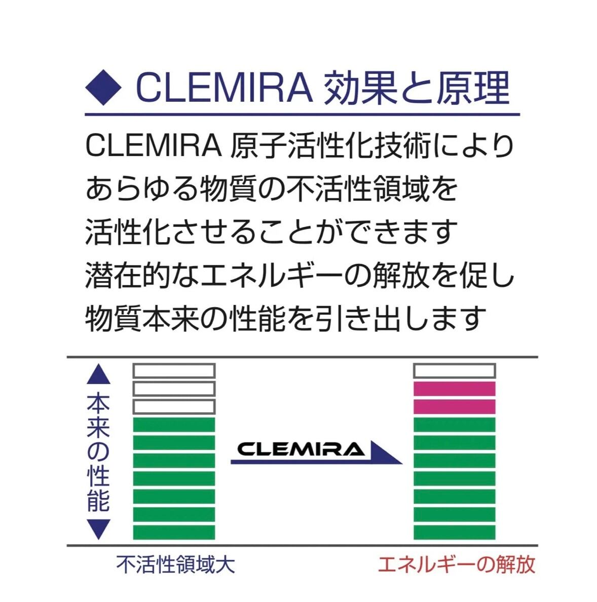 - 新開発のCLEMIRA真CORE TECHNOLOGYを施したコアが封入され、さらに究極の新技術CLEMIRA CORELESS TECHNOLOGYを施したケースから発する『量子のふるまい』によってあらゆる物質が活性化されると考えられています。